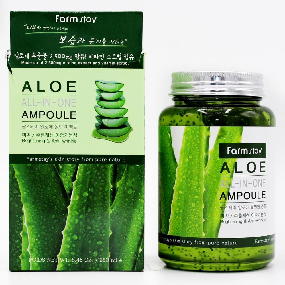 FarmStay Aloe Vera All In One Ampoule е ампулна грижа за кожата с екстракт от листа на алое вера известен със своите успокояващи и овлажняващ действия, както и създава бариера срещу загубата на влага от кожата, за да поддържа кожата хидратирана през целия ден.