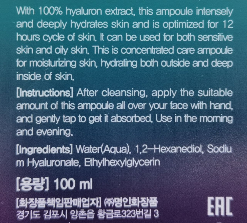 Формулиран със 100% хиалуронова киселина, за да създаде бариера срещу загубата на влага и да осигури дълбока хидратация на кожата. Възстановява баланса масло-вода в кожата. Подмладява кожата. Хидратира кожата и оптимизира за 12-часов цикъл на кожата, може да се използва както за чувствителна, така и за мазна кожа. Това е концентрирана ампула за грижа за овлажняване на кожата, хидратираща както външно, така и дълбоко напоена кожа.