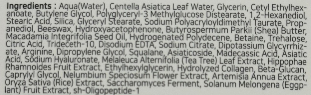 Asiaticoside, активен компонент на Centella asiatica, който ускорява заздравяването на рани, стимулира синтеза на колаген, има силно противовъзпалително и успокояващо действие, което намалява зачервявания и раздразнения. Подобрява хидратацията и укрепва кожната бариера, като същевременно подпомага регенерацията.