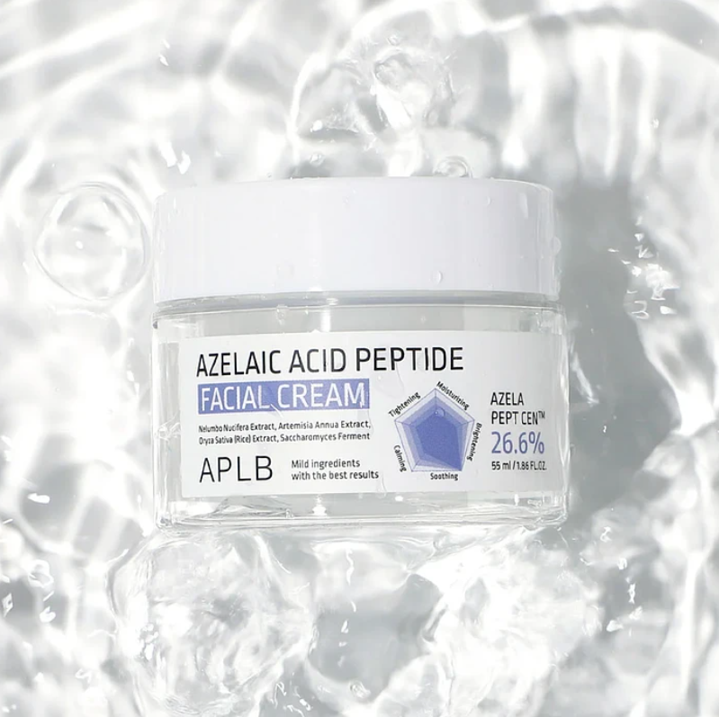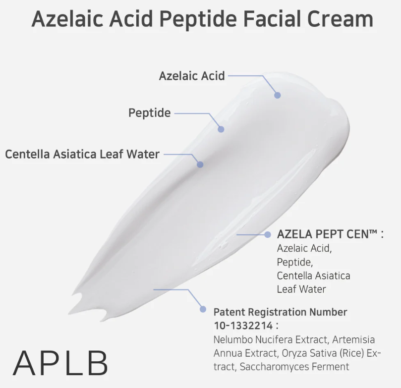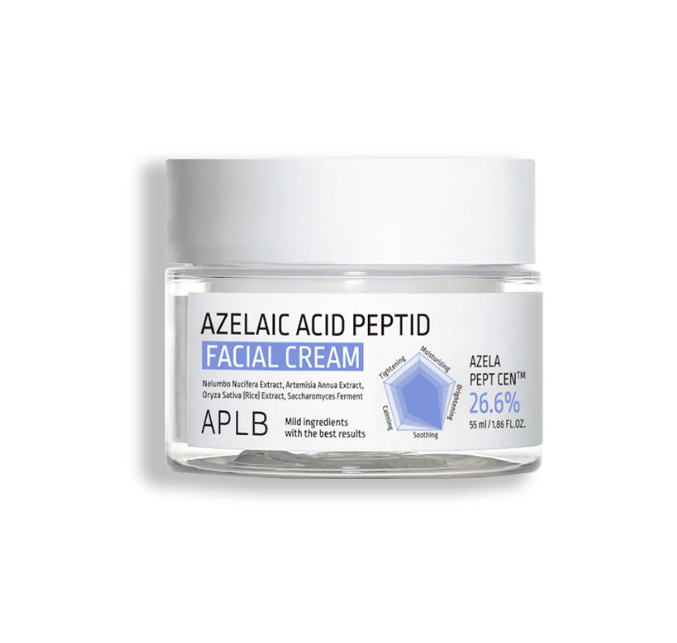 Крем за лице с азелаинова киселина и пептиди, е създаден за кожа, която иска баланс – чистота, гладкост и жизненост в едно. Формулата му съчетава азелаинова киселина, позната със способността си да пречиства и изравнява тена, и биоактивни пептиди, които подпомагат възстановяването и стегнатостта на кожата. Азелаиновата киселина действа като регулатор – намалява излишния себум, успокоява зачервяванията и поддържа здрав микробиом. sh-Oligopeptide-1, пептид с растежен фактор, активира процесите на клетъчно обновяване и подобрява текстурата на кожата отвътре. Азиатската центела с нейните активни молекули подсилва възстановяването и защитава бариерната функция. Хидролизираният колаген и хиалуроновата киселина възстановяват плътността и хидратацията, като придават гладък, равномерен релеф. Скваланът и маслата от ший и макадамия осигуряват кадифена мекота и защита без утежняване. Бета-глюканът и екстрактите от ориз и морски зърнастец действат като антиоксидантен щит, предпазвайки клетките от стрес и замърсявания. Текстурата е фина, адаптивна и се слива с кожата, оставяйки я спокойна и свежа.
