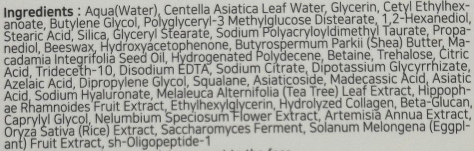 Asiaticoside, активен компонент на Centella asiatica, който ускорява заздравяването на рани, стимулира синтеза на колаген, има силно противовъзпалително и успокояващо действие, което намалява зачервявания и раздразнения. Подобрява хидратацията и укрепва кожната бариера, като същевременно подпомага регенерацията.