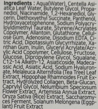 Екстрактът от Centella Asiatica интензивно регенерира, успокоява и укрепва бариерата на кожата, както и възстановява нивото на хидратация на кожата. Растение за заздравяване на рани с противовъзпалителни качества. Намалява умората, хиперпиментацията, дразненето и зачервяванията и повишава нивата на антиоксиданти в кожата.