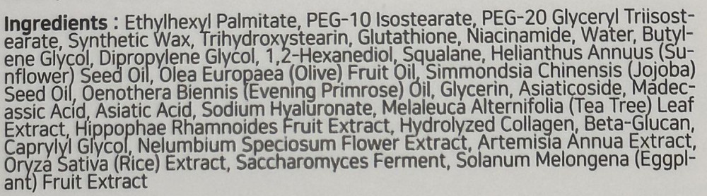 Asiaticoside, активен компонент на Centella asiatica, който ускорява заздравяването на рани и стимулира синтеза на колаген, подобрявайки плътността и еластичността на кожата. Действа като мощен антиоксидант, неутрализира свободните радикали и предпазва от увреждания, причинени от околната среда. Има силно противовъзпалително и успокояващо действие, което намалява зачервявания и раздразнения. Подобрява хидратацията и укрепва кожната бариера, като същевременно подпомага регенерацията, изглажда текстурата и намалява видимостта на белези и фини линии.