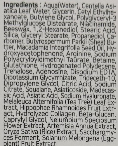 Екстрактът от Centella Asiatica интензивно регенерира, успокоява и укрепва бариерата на кожата, както и възстановява нивото на хидратация на кожата. Растение за заздравяване на рани с противовъзпалителни качества. Намалява умората, хиперпиментацията, дразненето и зачервяванията и повишава нивата на антиоксиданти в кожата.