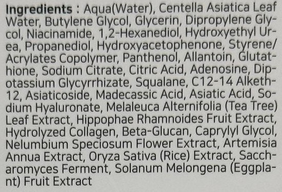 Екстрактът от Centella Asiatica интензивно регенерира, успокоява и укрепва бариерата на кожата, както и възстановява нивото на хидратация на кожата. Растение за заздравяване на рани с противовъзпалителни качества. Намалява умората, хиперпиментацията, дразненето и зачервяванията и повишава нивата на антиоксиданти в кожата.
