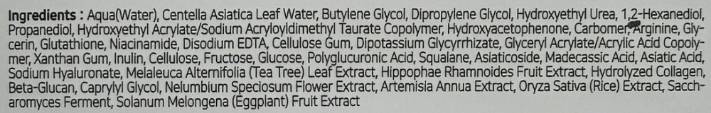 Екстрактът от Centella Asiatica интензивно регенерира, успокоява и укрепва бариерата на кожата, както и възстановява нивото на хидратация на кожата. Растение за заздравяване на рани с противовъзпалителни качества. Намалява умората, хиперпиментацията, дразненето и зачервяванията и повишава нивата на антиоксиданти в кожата.