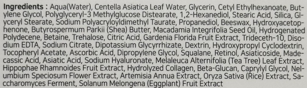 Asiaticoside, активен компонент на Centella asiatica, който ускорява заздравяването на рани, стимулира синтеза на колаген, има силно противовъзпалително и успокояващо действие, което намалява зачервявания и раздразнения. Подобрява хидратацията и укрепва кожната бариера, като същевременно подпомага регенерацията.