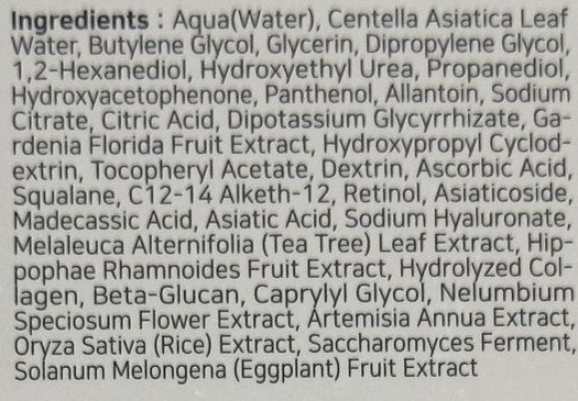 Екстрактът от Centella Asiatica интензивно регенерира, успокоява и укрепва бариерата на кожата, както и възстановява нивото на хидратация на кожата. Растение за заздравяване на рани с противовъзпалителни качества. Намалява умората, хиперпиментацията, дразненето и зачервяванията и повишава нивата на антиоксиданти в кожата.
