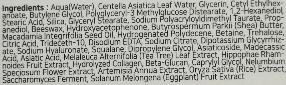Крем за лице със сквалан, хиалуронова киселина и азиатска центела, който съчетава активни съставки за хидратация, подхранване и възстановяване на кожата. Asiaticoside, азиатна и мадекасова киселина успокояват и подпомагат регенерацията. Бета-глюкан и бетаин поддържат хидратацията, а сквалан, масло от ший и макадамия дълбоко подхранват. Хиалуроновата киселина осигурява дълготрайна влага, колагенът подпомага еластичността, а лимонената киселина обновява кожата. Екстрактите от чаено дърво, морски зърнастец, лотос и ориз освежават и омекотяват. Резултатът е здрава, сияйна и добре поддържана кожа.