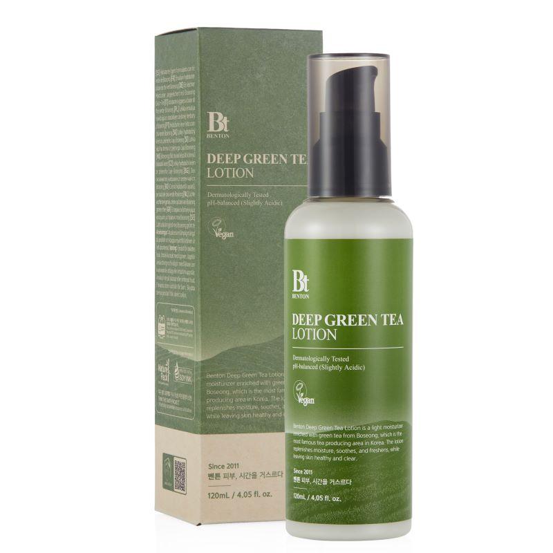 Той е специално разработен, за да се грижи за стресираната кожа и да възстанови баланса между влагата и маслата в кожата, особено при проблеми с излишното омазняване, включително мазна и комбинирана кожа. Лосионът е дерматологично тестван и предлага лека киселинна формула, която е нежна към чувствителната кожа.Съдържащите се растителни масла и обилно количество зелен чай предпазват кожата и помагат за възстановяването на водно-масления баланс при мазната кожа. Съставки като масло от слънчоглед, бетаин, екстракт от азиатска центела, екстракт от нар и екстракт от хутуиния кордата също допринасят за тази цел. Лосионът има свежа и хидратираща текстура, която се нанася леко и не оставя бял филм. Важно е, че този продукт не съдържа изкуствени аромати, летливи алкохоли, PEG-деривати или други раздразнители. Той е формулиран с натурални растителни съставки, които намаляват натоварването върху кожата. Benton Deep Green Tea Lotion е преминал през дерматологични тестове и е регистриран като продукт, подходящ за вегани.