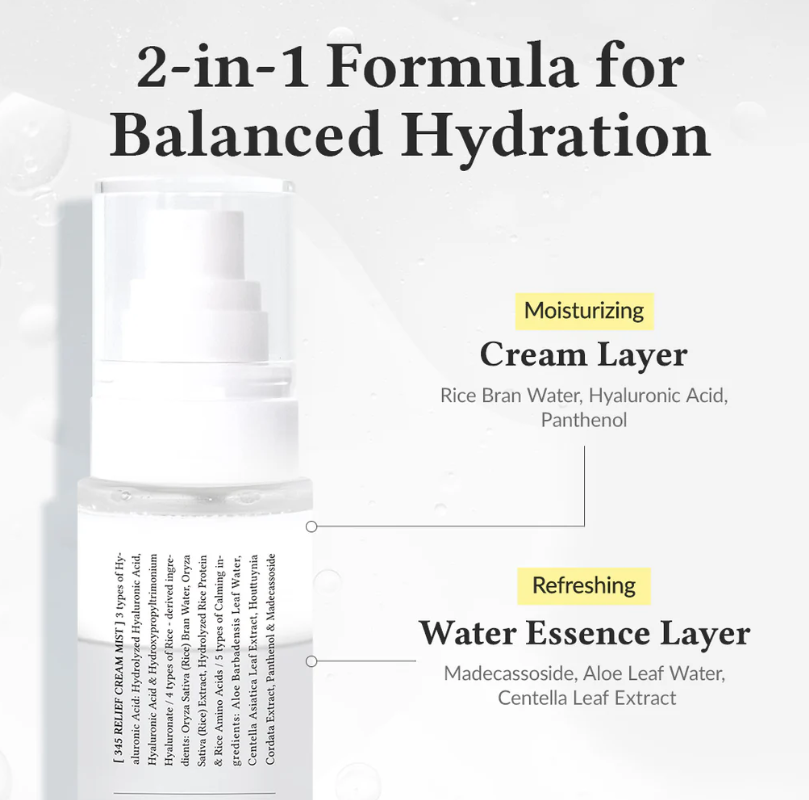 Мист-крем за лице с хиалуронова киселина, комплекс от азиатска центела, пантенол, алое вера и мадекасозид е създаден да доставя интензивна и дълбока хидратация на сухата кожа. Формулата е разработена с двуфазна структура – кремов слой и водно-есенционен слой, които комбинират богато подхранване с освежаваща хидратация за балансиран вид и приятно усещане на кожата. Миста моментално овлажнява кожата, благодарание на хиалуроновата киселина , като подпомага поддържането на продължителна хидратация през целия ден. Успокоява чувствителната кожа , благодарение на Centella Asiatica Leaf Extract и пантенола, намалява раздразненията и укрепва естествената бариера на кожата. Леката текстура се разпръсква нежно и равномерно, осигурявайки комфорт без тежест или лепкавост. Продуктът е идеален за всеки тип кожа и може да се използва по всяко време на деня за мигновено усещане за свежест. Съдържащите се активни съставки работят синергично за подобряване на общия хидратационен баланс и за поддържане на гладка и мека кожа. Този крем-мист предоставя удобен и ефективен начин за поддържане на кожата хидратирана, балансирана и видимо по-здрава. Подходящ е за използване преди или след грим, както и винаги, когато кожата има нужда от допълнително хидратацията и успокоение.