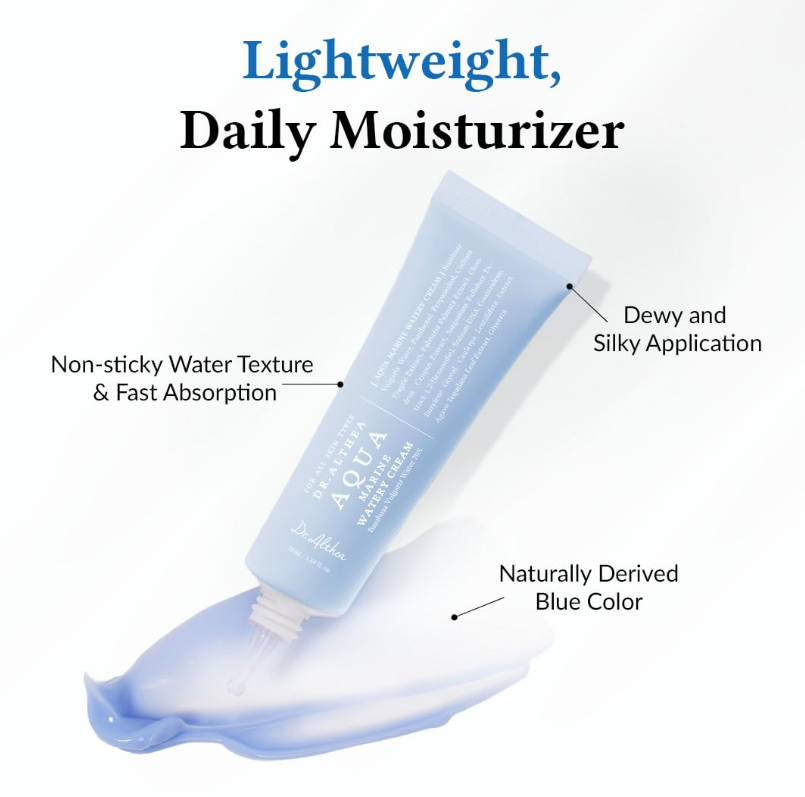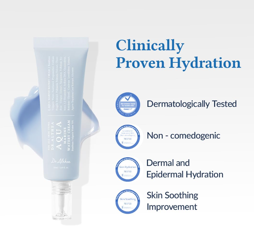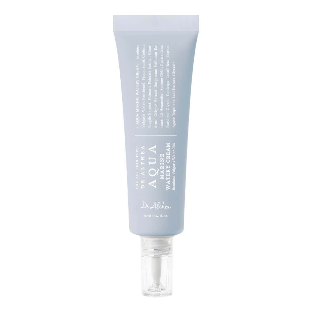 Крем за лице с 13 вида хиалуронова киселина, пантенол и бамбукова вода е с ултра хидратираща, нежна текстура, която се абсорбира бързо и оставя кожата гладка, еластична и освежена. Формулата е разработена с 70% бамбукова вода (Bambusa Vulgaris Water), която подпомага дълбоката и интензивна хидратация на кожата, спомагайки за отстраняване на сухотата и лющенето. Този крем съдържа пантенол в значителна концентрация, който подпомага укрепването на кожната бариера, успокоява раздразненията и задържа влагата за дълготрайно усещане за комфорт. Богатият състав включва 13 вида хиалуронова киселина, които работят на различни нива в кожата, за да осигурят многостепенна хидратация – от повърхността до по-дълбоките слоеве, като подобряват текстурата и плътността на кожата. Кремът подпомага възстановяването на кожната бариера, като намалява усещането за опъване и сухота и спомага за по-сияен и здрав вид на тена. Продуктът има водна, нелепнеща текстура, подходяща за ежедневна употреба, включително под грим или SPF.Aqua Marine Watery Cream може да бъде използван както сутрин, така и вечер след тонер и серум, за да заключи влагата и да осигури мека и гладка кожа през целия ден. Благодарение на своя хидратиращ характер този крем е особено подходящ за суха, дехидратирана или чувствителна кожа, която се нуждае от успокоение и възстановяване на хидролипидния баланс.