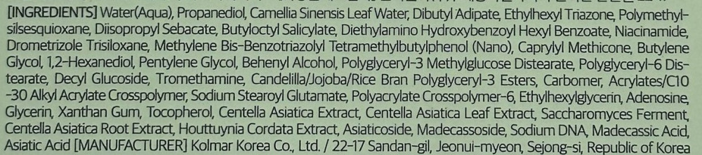 Екстрактът от Centella Asiatica интензивно регенерира, успокоява и укрепва бариерата на кожата, както и възстановява нивото на хидратация на кожата. Растение за заздравяване на рани с противовъзпалителни качества. Намалява умората, хиперпиментацията, дразненето и зачервяванията и повишава нивата на антиоксиданти в кожата.
