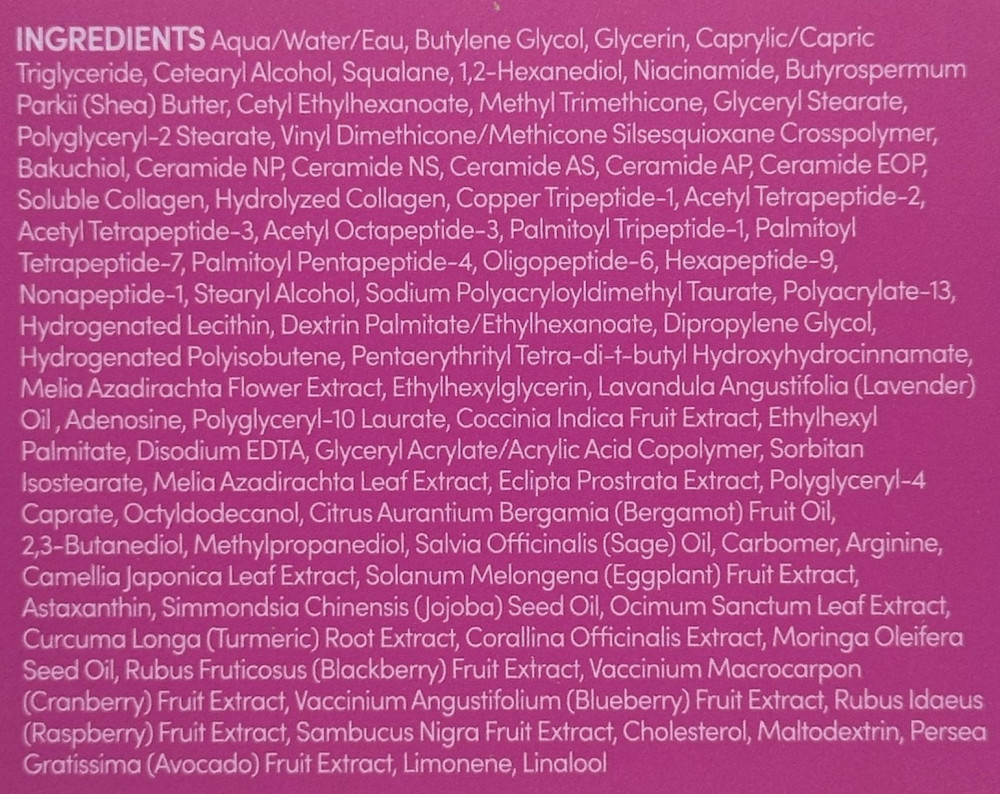 Крем за лице с 5 вида серамиди, 9 вида пептиди, бакучиол и сквалан. Крем основа Бакучиол + капсули Бакучиол за двоен ефект. Насърчава производството на колаген, подобрява еластичността на кожата и увеличава обема, докато хидратира и укрепва кожната бариера.