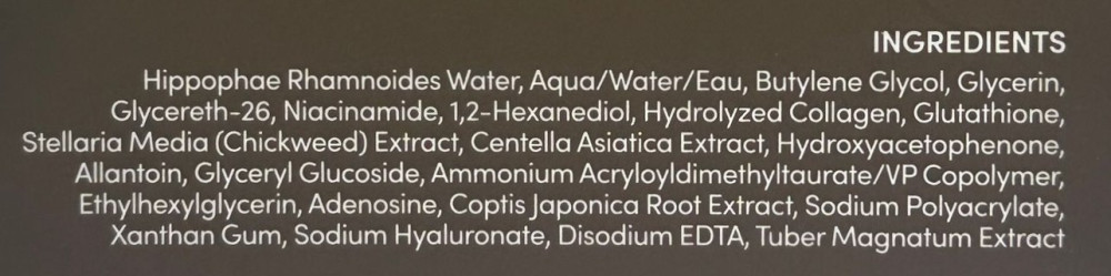 Тонер падове за лице обогатен с 410 000 ppm вода от морски зърнастец, глутатион, 00DA нискомолекулен колаген и азиатска центела за хидратиране, изсветляване и укрепване на кожната бариера в дълбочина. 98% чист глутатион, вода от Hippophae Rhamnoides и бял трюфел спомагат за намаляване на меланина, успокояване на раздразненията и подобряване на еластичността и блясъка на кожата. Богати на витамини и антиоксиданти, помагат за намаляване на несъвършенствата и укрепване на кожната бариера за здрав тен и стегната кожа.