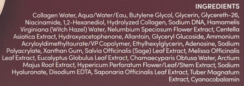Тонер падове за лице обогатени с 410 000 ppm колагенова вода и 200DA нискомолекулен колаген, PDRN от лотос, колаген и азиатска центела за дълбока хидратация, стягане и защита на кожната бариера. Падовете прилепват към кожата, за да осигури едновременно хидратация, еластичност и защита. Хидрогелната текстура минимизира раздразнението, като същевременно незабавно охлажда и успокоява чувствителната кожа. Мекият хидрогел прилепва плътно към извивките на кожата за безпроблемно, неплъзгащо се прилягане, което остава на мястото си ако желаете да ги използвате като маска.