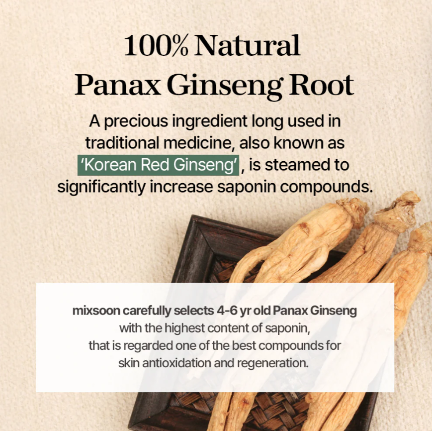 Екстрактът от женшен подобрява еластичността и има силно антиоксидантно действие, което предпазва от увреждания, причинени от UV лъчи и замърсяване. Женшенът също така изсветлява кожата, помагайки за избледняване на тъмните петна. Има противовъзпалителни свойства, които успокояват зачервяването и раздразнението, и насърчава по-бързото заздравяване на рани, като подпомага регенерацията на кожата.