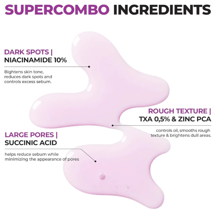 Транексамовата киселина (TXA) предлага няколко предимства в грижата за кожата, особено при лечението на хиперпигментация и мелазма. Освен това, TXA подобрява функцията на кожната бариера, подобрява задържането на влага и намалява постинфламаторната хиперпигментация след състояния като акне.