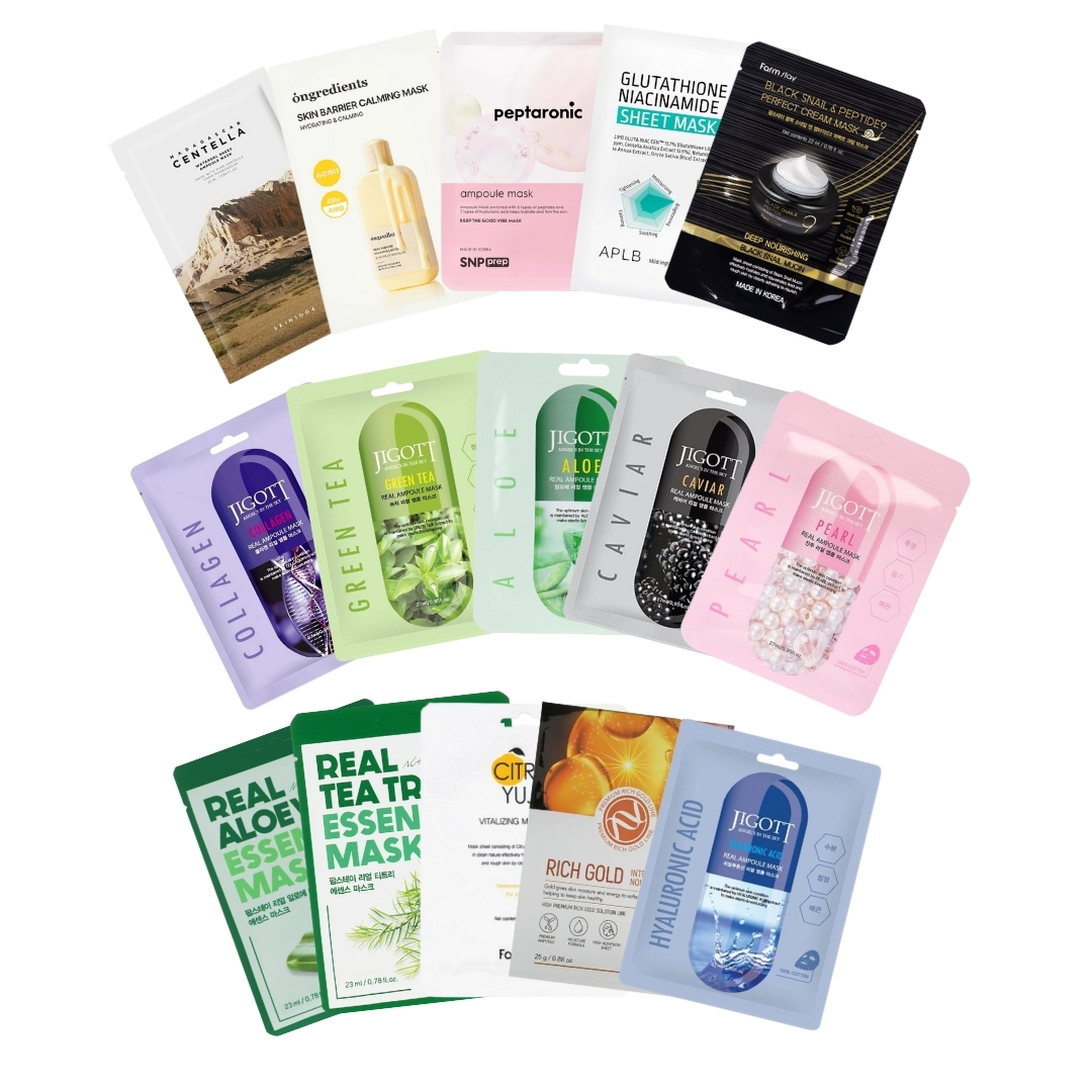 Този комплект включва 15 уникални формули, подбрани да покрият основните нужди на кожата – от успокояване с азиатска центела и алое вера, през дълбока хидратация с хиалуронова киселина, до подхранване с пептиди и злато. Всяка маска е представена с по 2 броя, което ви осигурява месец на непрекъсната, разнообразна и ефективна грижа.