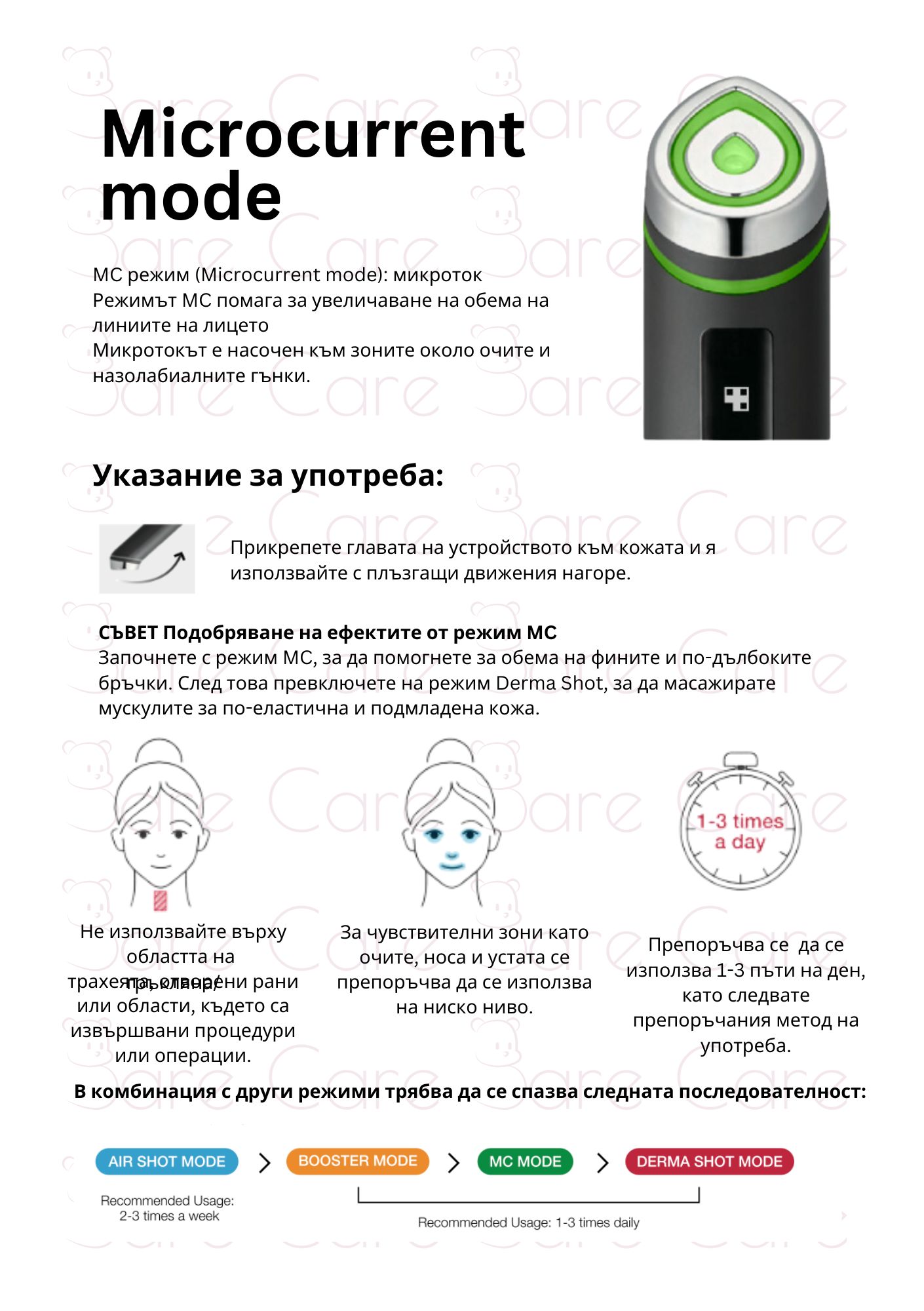 - Да, четири режима могат да се използват едновременно. След като използвате режима air shot на суха кожа, използвайте режимите бустер, микроток и дерма шот заедно с грижата за кожата, която използвате обикновено.