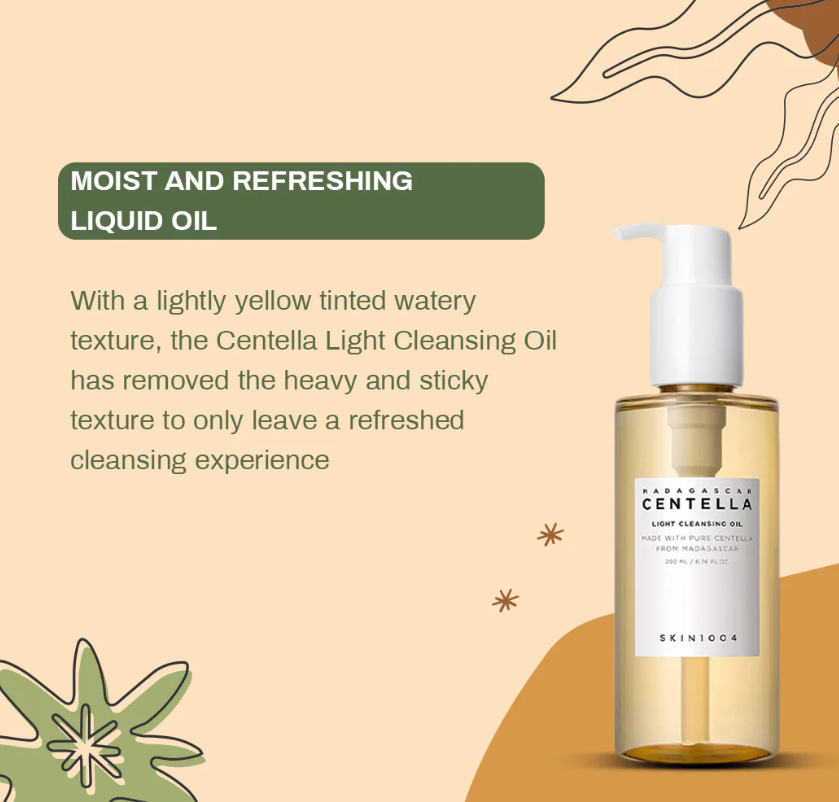 Лек почистващ продукт на маслена основа с азиатска центела, който нежно разтопява грима, мръсотията, маслата и слънцезащитния крем, без да дразни зоната около очите, като оставя освежаващ завършек върху кожата. Съдържа 6 вида растителни масла за предотвратяване на дразнене на кожата. Съдържа масло от жожоба богато на мастни киселини, омега-3 и антиоксиданти и слънчогледово масло богато на мастните киселини и витамин Е.
