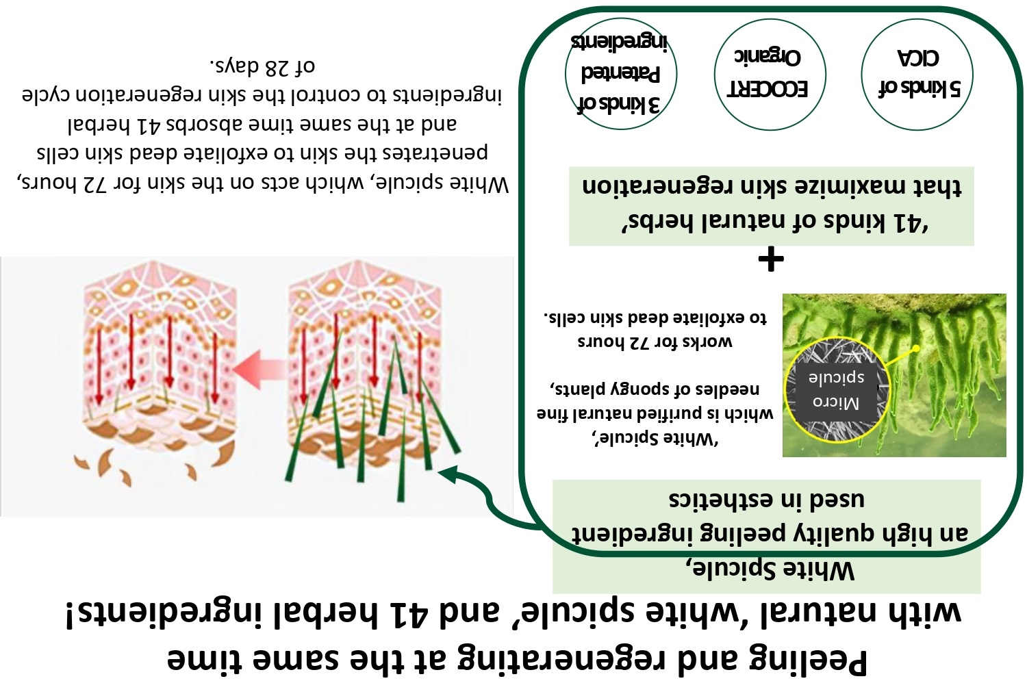 Пилинг и регенерация наведнъж. Успокояваща пилинг маска за лице с Бялата спикула и пептиди. Бялата спикула действа върху кожата в продължение на 72 часа, прониква в кожата, за да ексфолира мъртвите кожни клетки и в същото време абсорбира 41 билкови съставки, за да контролира цикъла на регенерация на кожата от 28 дни. Билковата маска тип Wash off е с видимо меки билкови листа за подобрява външния вид на текстурата на кожата и по този начин кожата е по-сияйна, по-гладъка, по-чиста и с по-равномерен тен. Комплексът от пептиди има подмладяващ ефект, спомага за изглаждане на бръчките и запазване на младостта на кожата. Подходящ за проблемна, чувствителна кожа, благодарение на изключителните си успокояващи, пречистващи свойства.