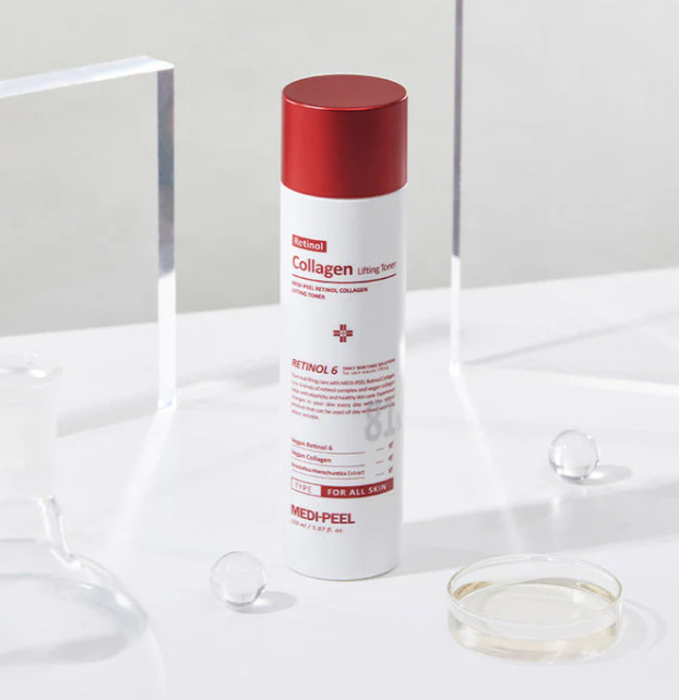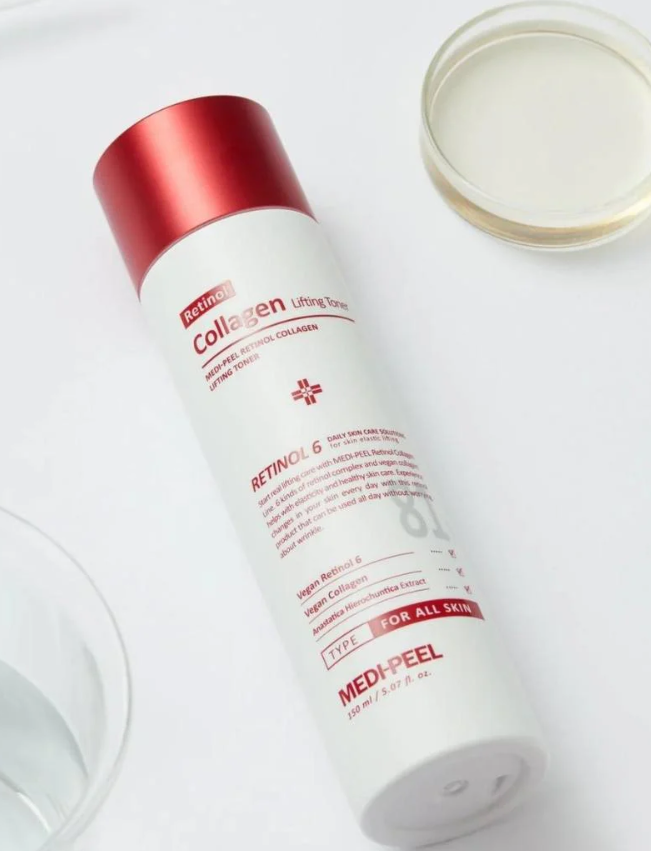 Тонер за лице с 6 вида ретинол и колаген, който намалява фините линии и бръчки, стяга контура на лицето и хидратира кожата.