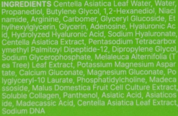 Екстрактът от Centella Asiatica интензивно регенерира, успокоява и укрепва бариерата на кожата, както и възстановява нивото на хидратация на кожата. Растение за заздравяване на рани с противовъзпалителни качества. Намалява умората, хиперпиментацията, дразненето и зачервяванията и повишава нивата на антиоксиданти в кожата.