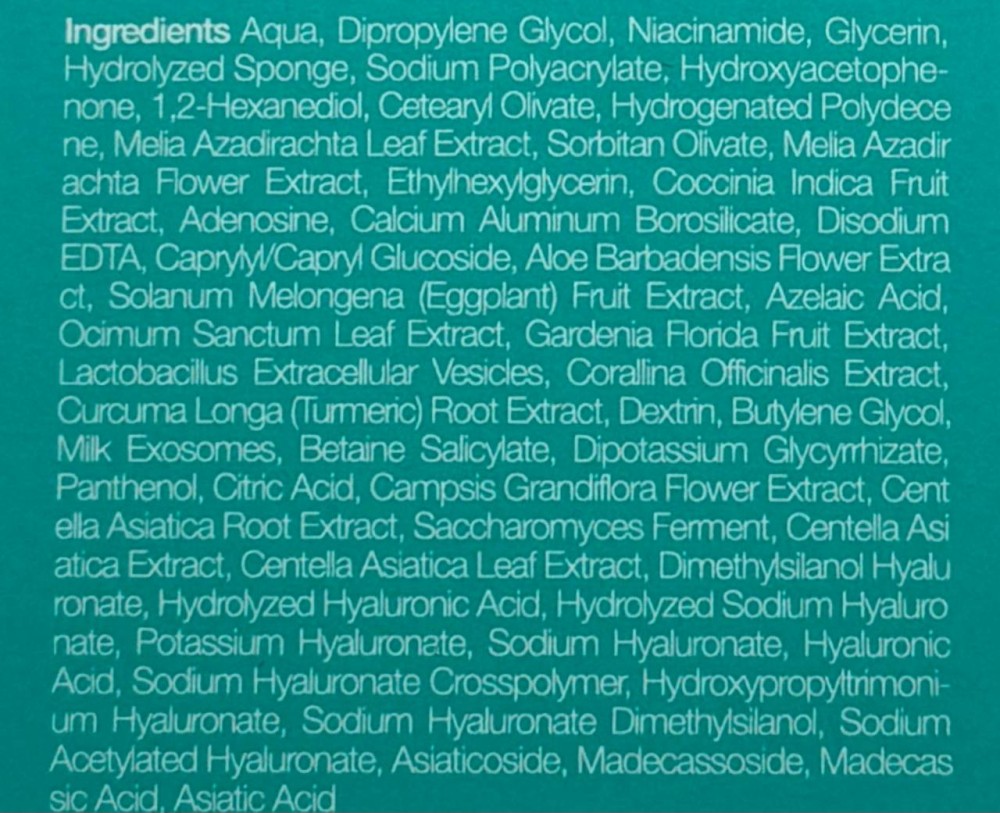 Екстрактът от Centella Asiatica интензивно регенерира, успокоява и укрепва бариерата на кожата, както и възстановява нивото на хидратация на кожата. Растение за заздравяване на рани с противовъзпалителни качества. Намалява умората, хиперпиментацията, дразненето и зачервяванията и повишава нивата на антиоксиданти в кожата.