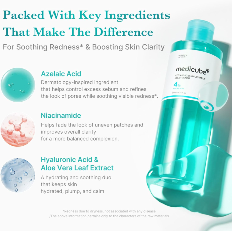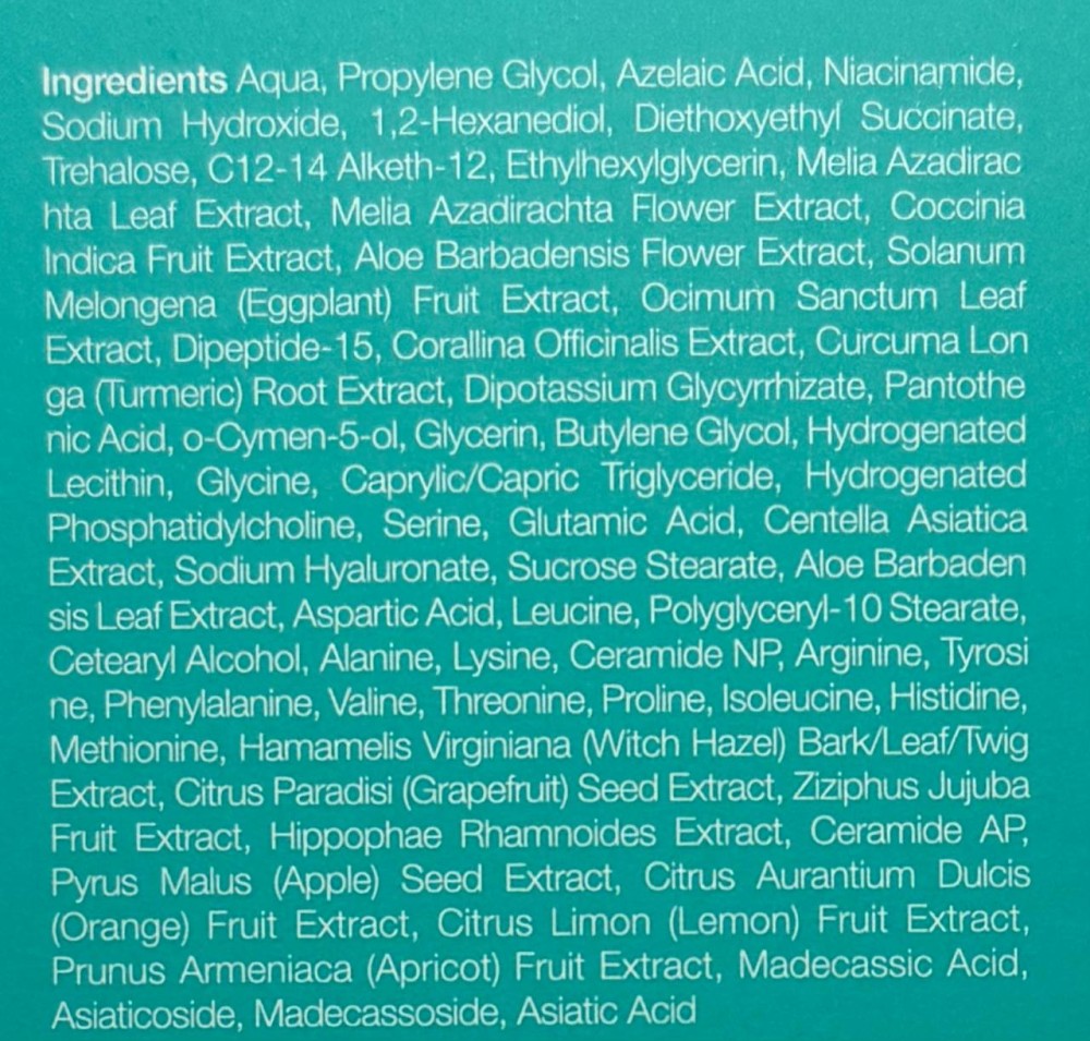 Азелаиновата киселина успокоява зачервена и чувствителна кожа и има противовъзпалителни и изсветляващи кожата свойства. Особено полезна съставка за кожа склонна към акне или розацея кожа. Азелаиновата киселина помага за избледняване на пост-възпалителни петна, белези от акне, а с редовна употреба изглажда текстурата, изравнява тена и придава здравословен блясък на кожата