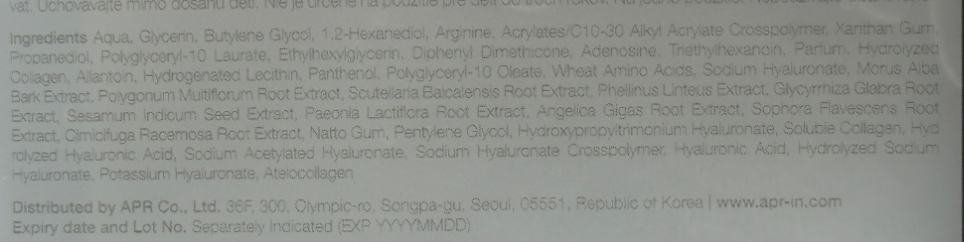 Хиалуроновата киселина прониква в кожата и изпълва клетките с необходимата влага. Укрепва и подобрява еластичността на кожата, предотвратявайки ранната поява на бръчки. Попълва липсата на влага и се бори с дехидратацията на кожата. Осигурява на кожата мекота, незабавно хидратира и успокоява сухата и изморена кожа.