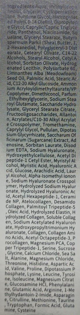 Крем за лице с 4 вида колаген, 5 вида пептиди, серамиди, 5 вида хиалуронова киселина, сквалан, който намалява бръчките и предотвратява образуването им, възстановява еластичността на кожата, хидратира и укрепва бариерата на кожата
