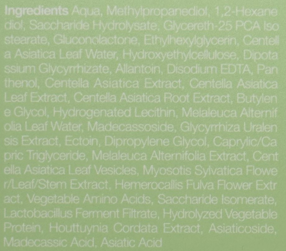 Екстрактът от Centella Asiatica интензивно регенерира, успокоява и укрепва бариерата на кожата, както и възстановява нивото на хидратация на кожата. Растение за заздравяване на рани с противовъзпалителни качества. Намалява умората, хиперпиментацията, дразненето и зачервяванията и повишава нивата на антиоксиданти в кожата.