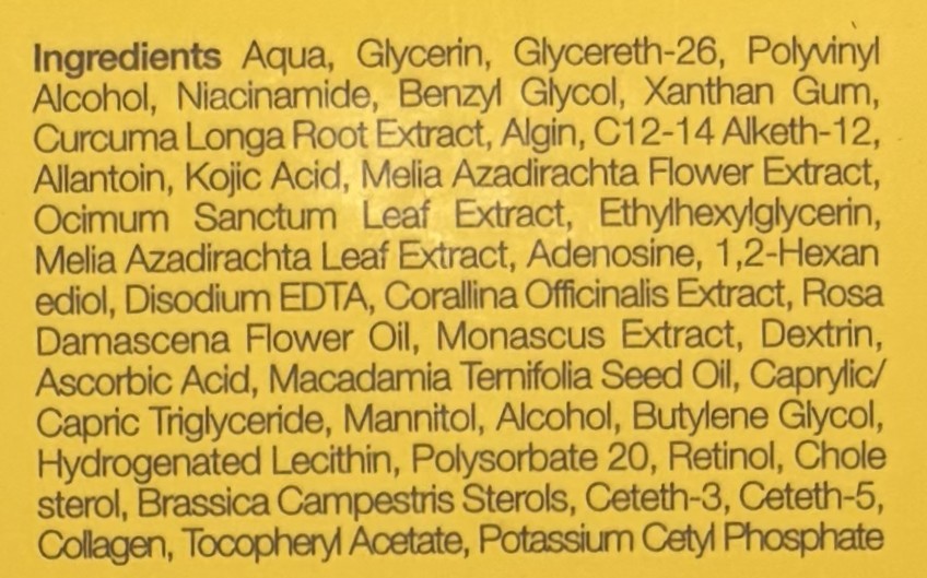 Аскорбиновата киселина (витамин С) предпазва кожата от свободните радикали, увеличава производството на колаген, подобрява еластичността на кожата и намалява бръчките, изсветлява кожата, изравнява тена на кожата и намалява хиперпигментацията.