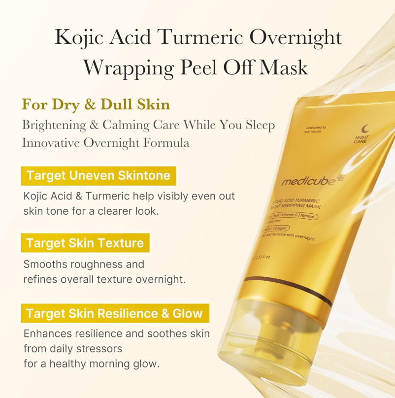 Нощна маска за лице с коджикова киселина, ретинол, куркума, колаген и витамин С е съвременна грижа за кожата, създадена да действа интензивно през нощта, когато процесите на възстановяване и регенерация в кожата са най-активни. Формулата образува тънък филм върху лицето, който задържа влагата и активните съставки, като същевременно подпомага по-дълбокото им проникване и максималната им ефективност. Коджиковата киселина е известна със своите силни изсветляващи свойства, като подпомага намаляването на тъмните петна, пигментациите и неравномерния тен, като същевременно допринася за по-сияйна и чиста кожа. Ретинолът стимулира обновяването на клетките и подпомага естествения синтез на колаген, което води до по-гладка кожа, намаляване на фините линии и подобряване на цялостната текстура на лицето. Куркумата е ценена съставка с мощни антиоксидантни и успокояващи свойства, която подпомага изравняването на тена и придава естествен блясък на кожата. Колагенът във формулата осигурява интензивна хидратация и подпомага поддържането на еластичността и плътността на кожата, като я прави по-мека, гладка и видимо по-стегната. Витамин С действа като силен антиоксидант, който защитава кожата от вредните външни фактори и подпомага изсветляването на тена, като едновременно стимулира производството на колаген. Комбинацията от тези активни съставки създава мощна формула, която работи едновременно върху хидратацията, озаряването и подмладяването на кожата. През нощта маската създава защитна „обвивка“, която помага на кожата да задържи влагата и хранителните вещества, като по този начин подпомага по-интензивното възстановяване на кожната бариера. При редовна употреба кожата изглежда по-сияйна, по-гладка и по-равномерна на цвят, а фините линии и признаците на умора са видимо намалени.