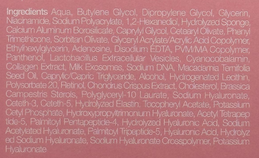 Ампула за лице със спикули, 8 вида хиалуронова киселина, екстракт от хайвер на сьомга и 3 вида пептиди е разработена като мощен бустер за възстановяване, регенерация и видимо подобряване на кожната текстура. Формулата съдържа екзозоми, които действат като „био-куриери“ — транспортират активни молекули дълбоко в кожата, подпомагайки клетъчната комуникация, стимулирайки обновяването и подпомагайки здравословната дейност на дермата. Серумът използва PDRN (полидезоксирибонуклеотид), извлечен от сьомга, който подпомага регенерацията на кожните клетки и поддържането на здрава кожа, съдействайки за стегнатост, еластичност и по-младежки вид. Добавеният колаген с ниско молекулно тегло подпомага структурата и плътността на кожата, подпомагайки намаляване на отпускането и подобрявайки здравината. Формулата е обогатена с многовалентна хидратация, което гарантира, че кожата запазва влагата — от повърхността до по-дълбоките слоеве — осигурявайки усещане за мекота и свежест. Ампулата разчита на микроскопични спикули, които подпомагат проникването на активните съставки, като подобряват абсорбцията им, осигурявайки по-ефективен и бърз резултат. При употреба кожната повърхност се усеща по-гладка, текстурата — по-фина и равна, а порите - по-минимизирани и по-здрави. Ефектът включва и видимо подобряване на блясъка и сияйността на кожата - коригира „уморен“ тен и придава по-здрав и озарен външен вид. Серумът е формулиран така, че да бъде подходящ и за кожа, склонна към чувствителност, чрез балансирана, модерна текстура, която се абсорбира бързо и не оставя усещане за тежест или лепкавост. Редовната употреба на PDRN Pink Collagen Exosome Shot подпомага обновяването на кожната бариера, повишава здравината и еластичността на кожата и може да подпомогне редуцирането на несъвършенства, неравности и загуба на тонус. Тази ампула е отличен избор за хора, търсещи интензивна грижа с дълбоко възстановяващо, укрепващо и сияйно действие — подходяща след агресивни процедури, сезонни промени или при нужда от „бустер“ ефект за кожа, загубила блясък и жизненост.