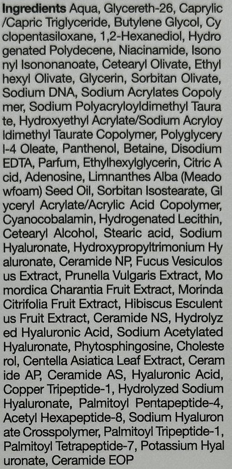 Крем за лице с PDRN, 6 вида пептиди, 5 вида серамиди, 8 вида хиалуронова киселина, азиатска центела и пантенол, който се бори с несъвършенства, подобрява еластичността и хидратацията, изсветлява неравномерния тен на кожата и укрепва кожната бариера. Пептидите стимулират производството на колаген, разкривайки гладка и стегната кожа. Пантенолът и екстрактът от центела осигуряват допълнителни успокояващи ефекти.