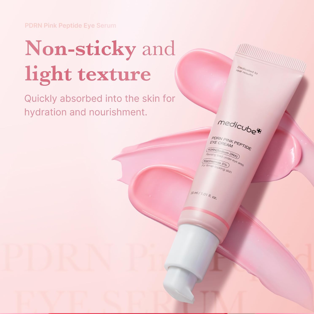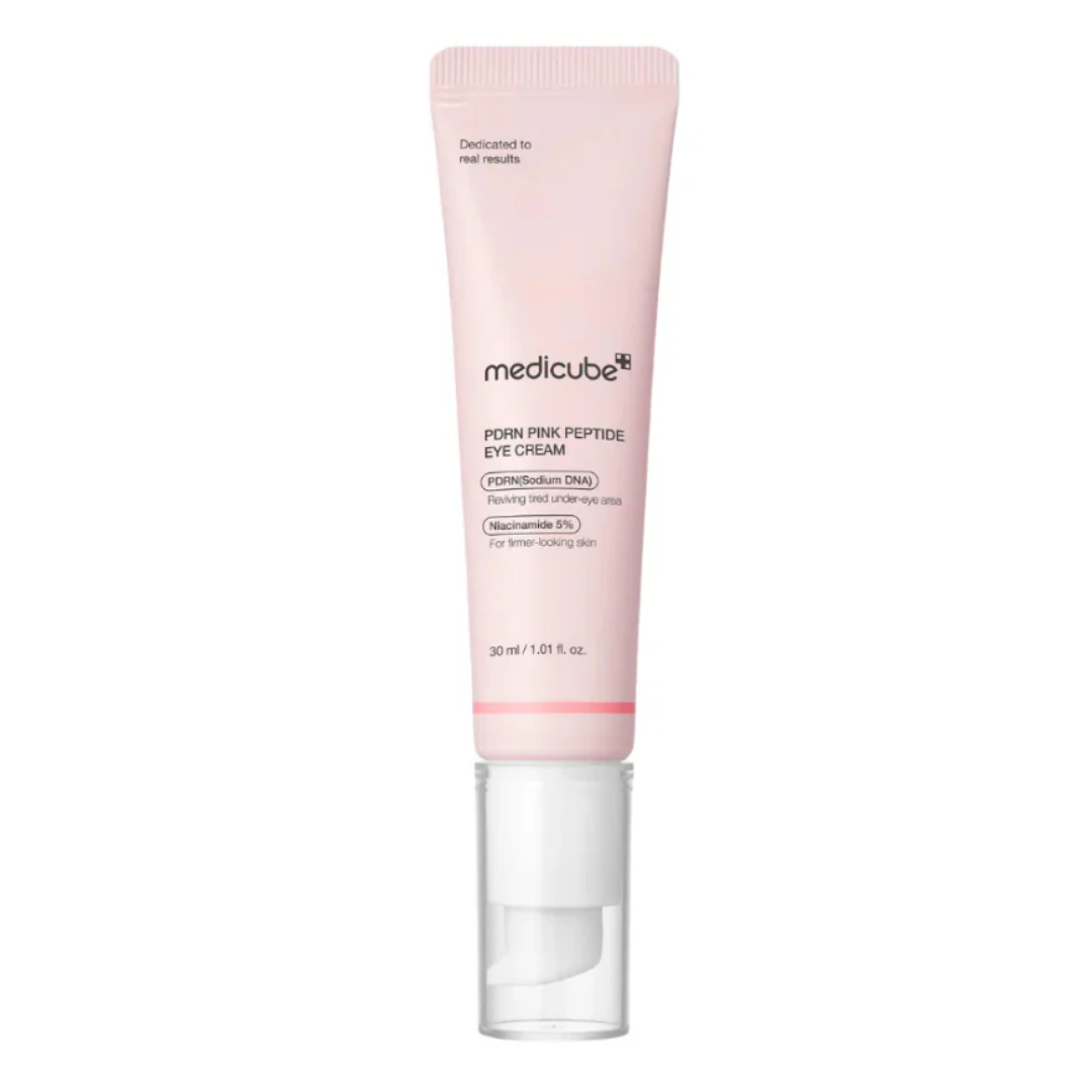 Околоочен крем с ретинол, екстракт от хайвер на сьомга, куркума, ниацинамид и 5 вида пептиди комбинира силно регенериращи и подхранващи активни съставки за видимо подобрение на кожата в деликатната зона около очите. Формулата съдържа PDRN (Salmon DNA), който стимулира клетъчната регенерация, подпомага синтеза на колаген и еластин, и така подобрява плътността, гладкостта и устойчивостта на кожата. Включени са пептиди, които подпомагат укрепването на дермалния матрикс и редуцират появата на фини линии и бръчки, като повишават стегнатостта и еластичността. Ниацинамид работи за изравняване на тена, намаляване на тъмни кръгове и осигурява подхранване, като подкрепя кожната бариера и хидратацията. В състава присъства и ретинол, който ускорява обновяването на кожните клетки, подпомага колагеновия синтез и допринася за по-гладък, младежки вид. Формулата е обогатена с екстракт от куркума, който носи антиоксидантно и успокояващо действие, помага за намаляване на възпаление и подпухналост, допринасяйки за сияен и здрав вид на кожата. Допълнителния екстракт от Coffea Arabica (арабика) подпомага микроциркулацията и освежаването на зоната около очите, като може да подпомогне намаляване на подпухналост и „торбички“ под очите. Кремът има лека, нежна текстура, която се абсорбира бързо, без да оставя омазняващ филм, и е подходящ за ежедневна употреба — сутрин и/или вечер. Редовната му употреба води до по-еластична, плътна и хидратирана кожа около очите, с по-мека текстура и по-равномерен тон. Medicube PDRN Pink Peptide Eye Cream е отличен избор за всеки, който търси концентрирана грижа за околоочната зона — особено при първи признаци на състаряване, отпусната кожа, тъмни кръгове или нужда от интензивна хидратация.