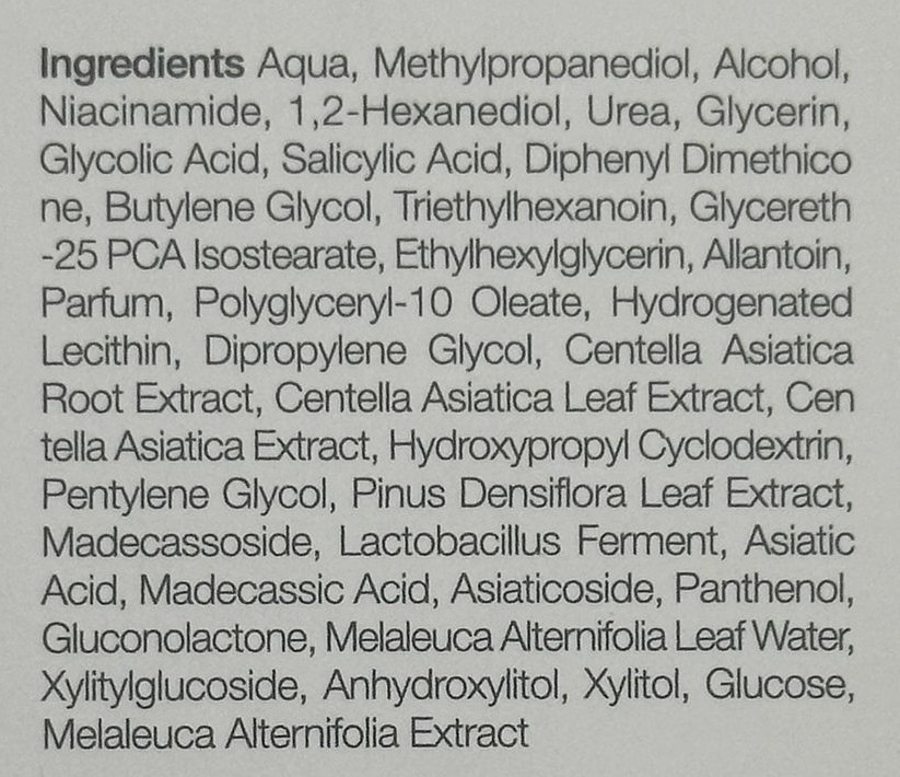 Asiaticoside, активен компонент на Centella asiatica, който ускорява заздравяването на рани, стимулира синтеза на колаген, има силно противовъзпалително и успокояващо действие, което намалява зачервявания и раздразнения. Подобрява хидратацията и укрепва кожната бариера, като същевременно подпомага регенерацията.