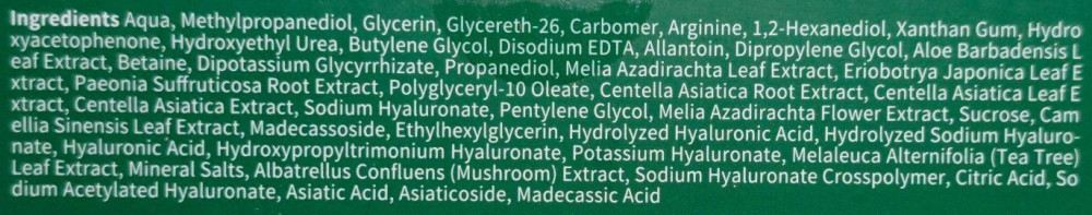 Екстрактът от Centella Asiatica интензивно регенерира, успокоява и укрепва бариерата на кожата, както и възстановява нивото на хидратация на кожата. Растение за заздравяване на рани с противовъзпалителни качества. Намалява умората, хиперпиментацията, дразненето и зачервяванията и повишава нивата на антиоксиданти в кожата.