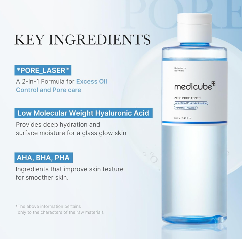 Тонер за лице с ВНА, АНА, РНА И комплекс от хиалуронова киселина е високо ефективен, научно формулиран тонер, създаден да комбинира хидратация и грижа за порите в една стъпка чрез иновативната си 2-в-1 Pore Laser Water Formula, която спомага за контрол на излишния себум и подобрява цялостния вид на кожата. Формулата е без алкохол и е клинично тествана за повишаване на кожната хидратация с над 21.7%, като същевременно намалява себумните нива и подпомага ексфолирането на до 56% от мъртвите кожни клетки след две седмици редовна употреба. Клиничните резултати показват и видимо намаляване на размера на порите с до 30.6%. Леката, водниста текстура се абсорбира бързо и е подходяща за всички типове кожа, включително чувствителна, без да предизвиква усещане за тежест или лепкавост. Тонерът подобрява еластичността на кожата с 32.2% и допринася за по-гладка и равномерна текстура още след първото използване. При редовна употреба Medicube Zero Pore Toner оставя кожата свежа, балансирана и видимо по-гладка, като я подготвя оптимално за следващите стъпки в грижата или нанасяне на грим. Продуктът предлага цялостна, научно подкрепена грижа за кожа с разширени пори, неравна текстура и склонност към омазняване.