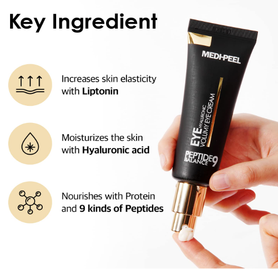 Околоочен крем за стегната околоочна зона с 9 вида пептиди, 4 вида хиалуронова киселина, ниацинамид и патентовани съставки (Liftonin ) за борба с признаците на стареене и за повишаване на еластичността на кожата.