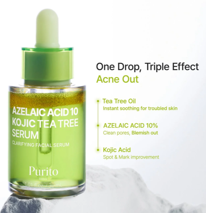 Серум за лице с азелаинова киселина, коджикова киселина и екстракт от чаено дърво представлява висококонцентрирана дерматологично ориентирана формула, разработена за цялостно повлияване на акнеичната кожа, поствъзпалителната хиперпигментация и неравномерния тен. Продуктът комбинира синергично действие на три ключови активни компонента – 10% азелаинова киселина, tea tree комплекс и коджикова киселина, които заедно формират мултифункционална система, насочена към различните етапи в развитието на несъвършенствата. Азелаиновата киселина в концентрация от 10% действа като основен биологично активен агент, подпомагащ изчистването на кожата, редуцирането на видимите несъвършенства и подобряването на текстурата, като същевременно допринася за изравняване на тена и поддържане на здрава кожна бариера. Допълващият компонент от чаено дърво, участва в таргетиране на проблемната кожа и подпомага процесите на пречистване, докато коджиковата киселина допринася за видимо изсветляване и редуциране на пигментните изменения. Комбинираният активен комплекс, достигащ общо 20% функционална активност, е създаден да осигури бързо и ефективно действие, като адресира едновременно активните възпалителни процеси, остатъчните следи от акне и неравномерния кожен релеф. Формулата демонстрира висока ефективност при подобряване на цялостния вид на кожата, като подпомага редуцирането на пъпки, изглаждането на текстурата и постигането на по-равномерен и чист тен. Серумната текстура е лека и бързо абсорбираща се, което позволява оптимално проникване на активните съставки без усещане за тежест, правейки продукта подходящ за ежедневна употреба при кожа, склонна към несъвършенства.