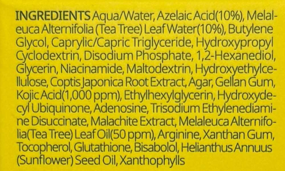 Азелаиновата киселина е нежен ексфолиант, който подобрява текстурата на кожата и намалява несъвършенствата и техните следи. Азелаиновата киселина успокоява зачервена и чувствителна кожа и има противовъзпалителни и изсветляващи кожата свойства. Особено полезна съставка за кожа склонна към акне или розацея кожа. Азелаиновата киселина блокира прекомерното образуване на меланин, което помага за избледняване на пост-възпалителни петна, белези от акне и мелазма, а с редовна употреба изглажда текстурата, изравнява тена и придава здравословен блясък – всичко това с минимален риск от фоточувствителност или силно лющене.