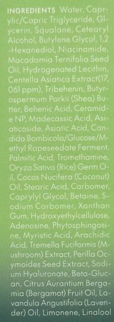 Екстрактът от Centella Asiatica интензивно регенерира, успокоява и укрепва бариерата на кожата, както и възстановява нивото на хидратация на кожата. Растение за заздравяване на рани с противовъзпалителни качества. Намалява умората, хиперпиментацията, дразненето и зачервяванията и повишава нивата на антиоксиданти в кожата.