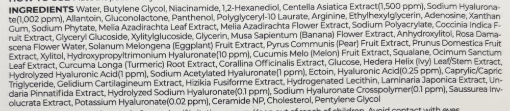 Екстрактът от Centella Asiatica интензивно регенерира, успокоява и укрепва бариерата на кожата, както и възстановява нивото на хидратация на кожата. Растение за заздравяване на рани с противовъзпалителни качества. Намалява умората, хиперпиментацията, дразненето и зачервяванията и повишава нивата на антиоксиданти в кожата.