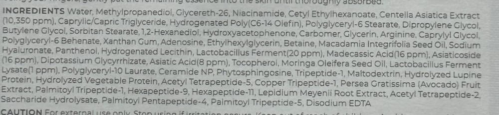 Екстрактът от Centella Asiatica интензивно регенерира, успокоява и укрепва бариерата на кожата, както и възстановява нивото на хидратация на кожата. Растение за заздравяване на рани с противовъзпалителни качества. Намалява умората, хиперпиментацията, дразненето и зачервяванията и повишава нивата на антиоксиданти в кожата.