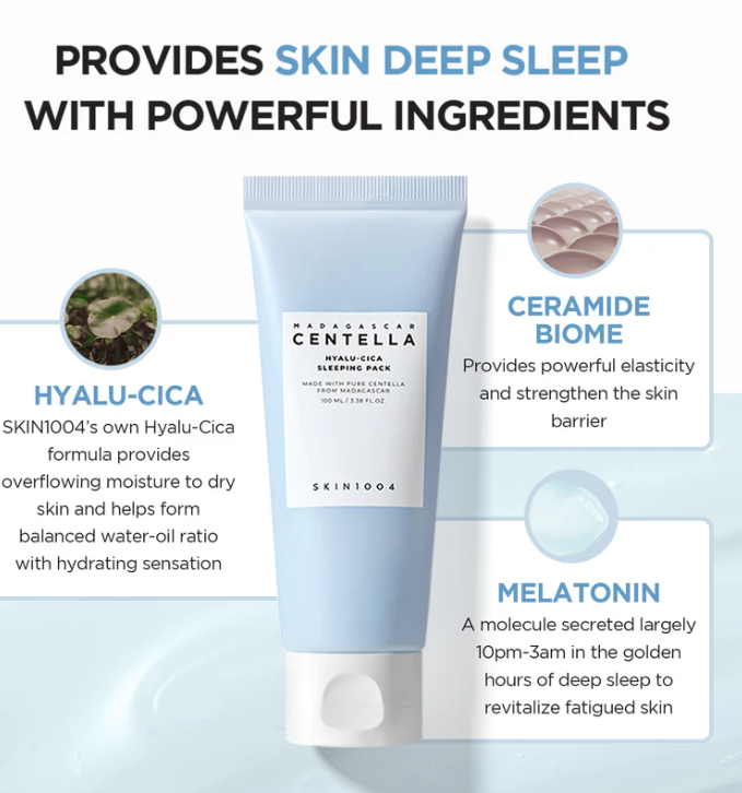 Нощна маска за лице съдържаща хиалуронова киселина, азиатска центела, ниацинамид, аденозин и серамиди. Хиалуронова киселина и серамиди, които помагат за повишаване нивото на влажност на кожата и укрепват бариерата на кожата, за да не загуби влагата. Богат екстракт от Centella Asiatica от Мадагаскар облекчава зачервявания и раздразнения по кожата. Ниацинамид и аденозин за избелване и борбата с бръчките. Маската успокоява сухата и чувствителна кожа, като същевременно осигурява енергия на кожата. Естествените съставки Artemisia Herba и екстракт от хибискус Esculentus повишават еластичността на кожата, озаряват и защитават кожната бариера.