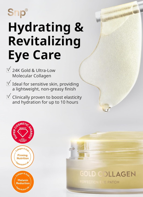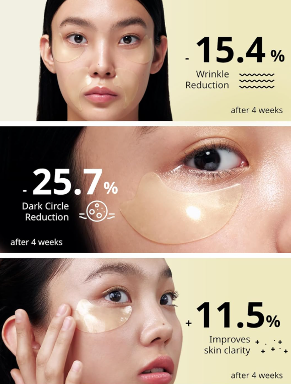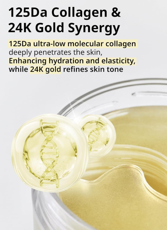 Пачове за очи с колаген, нискомолекулярно злато и бета-глюкан – са интензивни хидрогелни пачове, създадени за ежедневна грижа на деликатната зона под очите. Тези пачове съдържат ултра-нискомолекулен колаген (125 DA), който се абсорбира по-лесно и подпомага подобряване на еластичността и гъвкавостта на кожата около очите. Включеното 24K злато придава сияйна и лъскава текстура на кожата, подобрявайки видимия тон. Формулата е допълнена с бета-глюкан, известен със своя хидратиращ и успокояващ ефект, който подпомага поддържането на влажността и комфорта на околоочната зона . Пачовете таргетират бръчките около очите, тъмните кръгове и нездравословния оттенък на кожата. След 4-седмична употреба е наблюдавано намаляване на меланина, което прави кожата по-сияйна и по-ярка, както и значително намаляване на бръчките около очите (-15,47%) . Продуктът е потвърден за подходящ за чувствителна кожа след тестове за раздразнение. Хидрогелната текстура прилепва плътно към кожата, позволявайки активните съставки да проникнат дълбоко и да се усвоят ефективно.