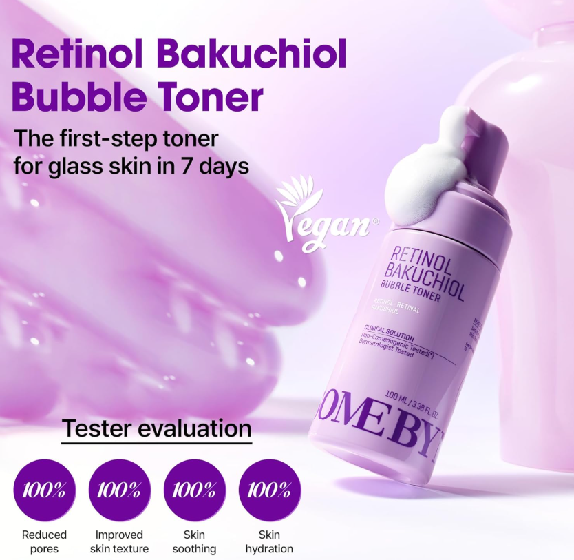 Тонер за лице с бакучиол, ретинал, ретинол и AHA, създаден да подпомага обновяването на кожата, да изглажда текстурата и да подобрява еластичността за по-свеж и равномерен тен. Иновативната формула се превръща във фина пяна при нанасяне, чиито микро мехурчета спомагат за равномерното разпределяне на активните съставки и по-ефективното им усвояване от кожата. Комбинацията от ретинол, ретинал и бакучиол работи за намаляване на видимостта на фините линии, подпомага стягането на кожата и подобрява цялостната текстура на тена, като същевременно е нежна към чувствителната кожа. Задължително е използване на слънцезащита след използване на продукт с тези съставки. AHA киселината подпомага нежното ексфолиране на повърхностните мъртви клетки, като спомагат за по-гладка кожа и по-равномерен тен. Формулата допринася за почистване на порите и намаляване на излишния себум, като оставя кожата свежа и балансирана след употреба. Допълнителните хидратиращи съставки помагат за задържане на влагата и предотвратяват усещането за сухота след ексфолиране. Тонерът подготвя кожата за следващите стъпки от грижата, като подобрява усвояването на серуми и кремове. Леката текстура попива бързо без лепкаво усещане и прави продукта подходящ за ежедневна вечерна грижа при кожа с неравна текстура, разширени пори или първи признаци на стареене. При редовна употреба след 4 седмици се наблюдава цялостно подобрение на порите и тена, кожата изглежда по-гладка, по-стегната и видимо освежена, което прави продукта отличен избор за рутина, насочена към обновяване и подобряване на цялостното състояние на кожата.